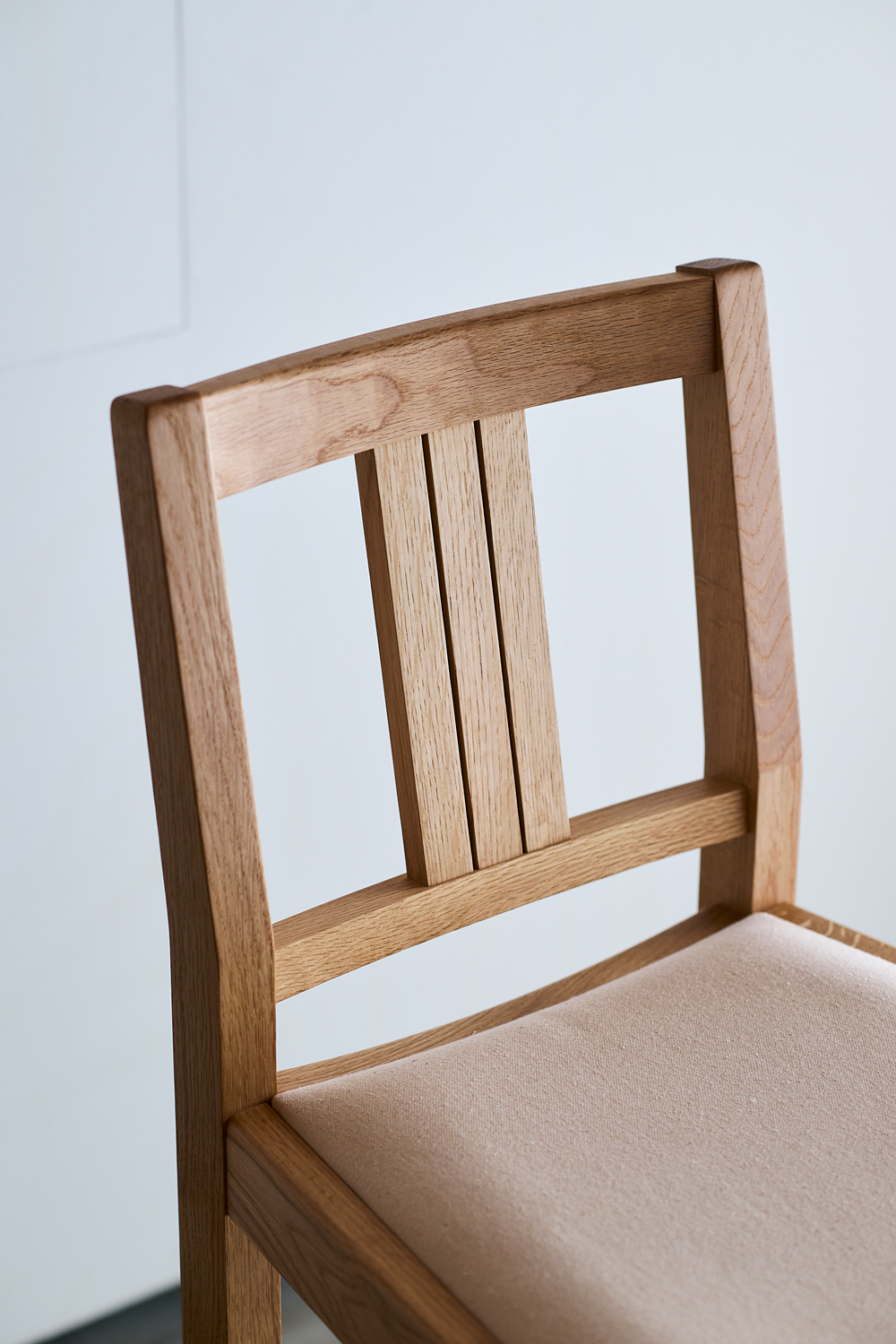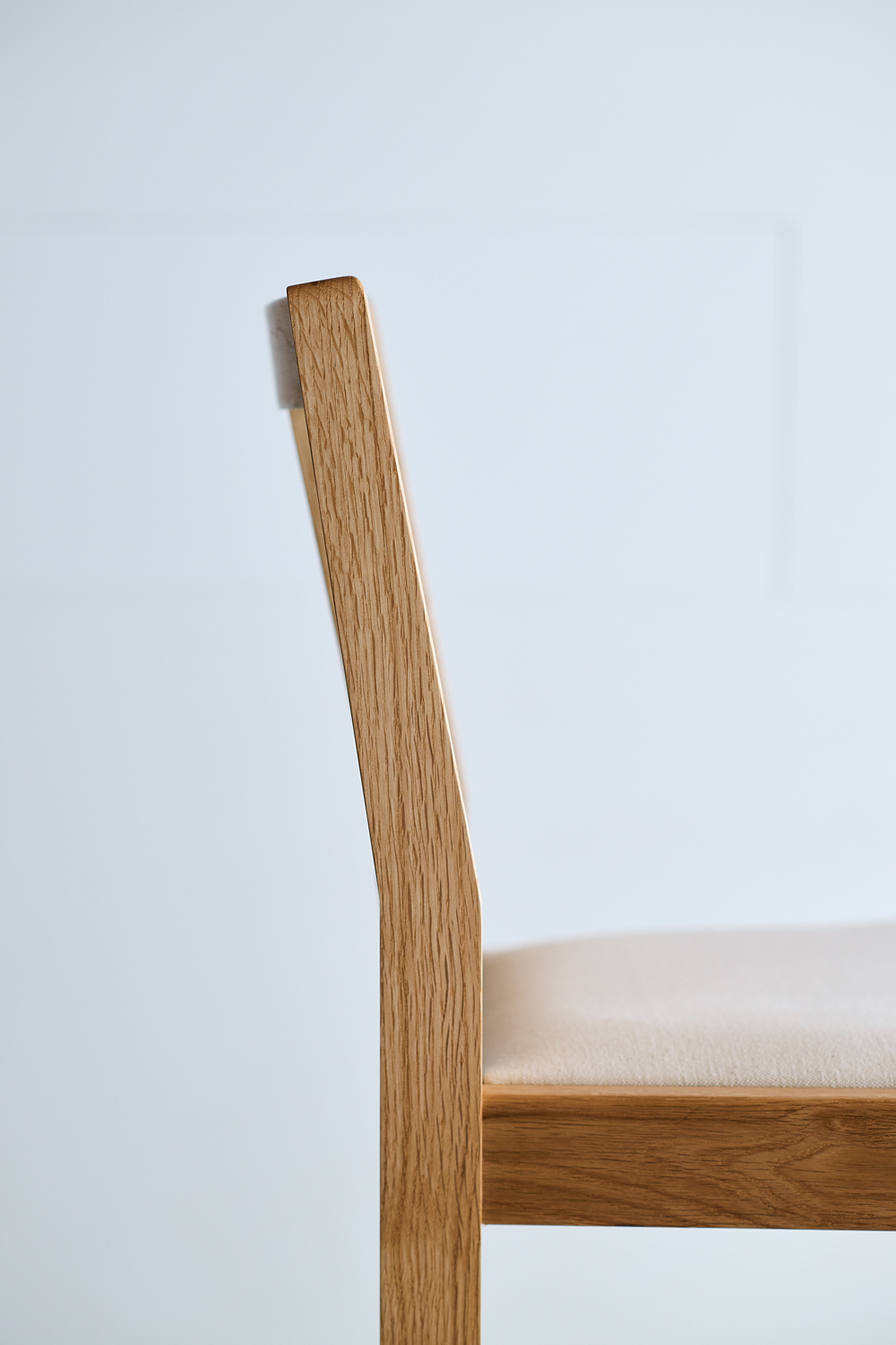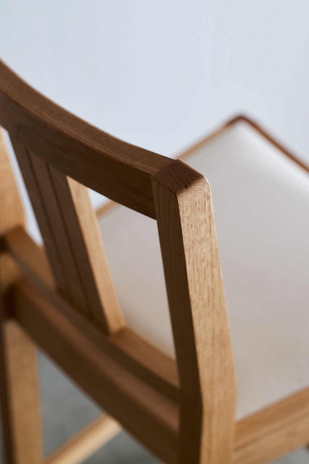 TypeⅡは、無垢材を丁寧に削り出した、流れるような曲線が特徴。職人の手で丁寧に仕上げられた滑らかな背面は、背中に心地よく寄り添います。部材同士のなめらかな接合から、手仕事ならではの柔らかさも感じられます。TypeⅢは、無垢材本来の表情を活かし、直線を基調としたシャープなフォルム。古いチェアを思わせる素朴さと、温もりのある佇まいが魅力です。